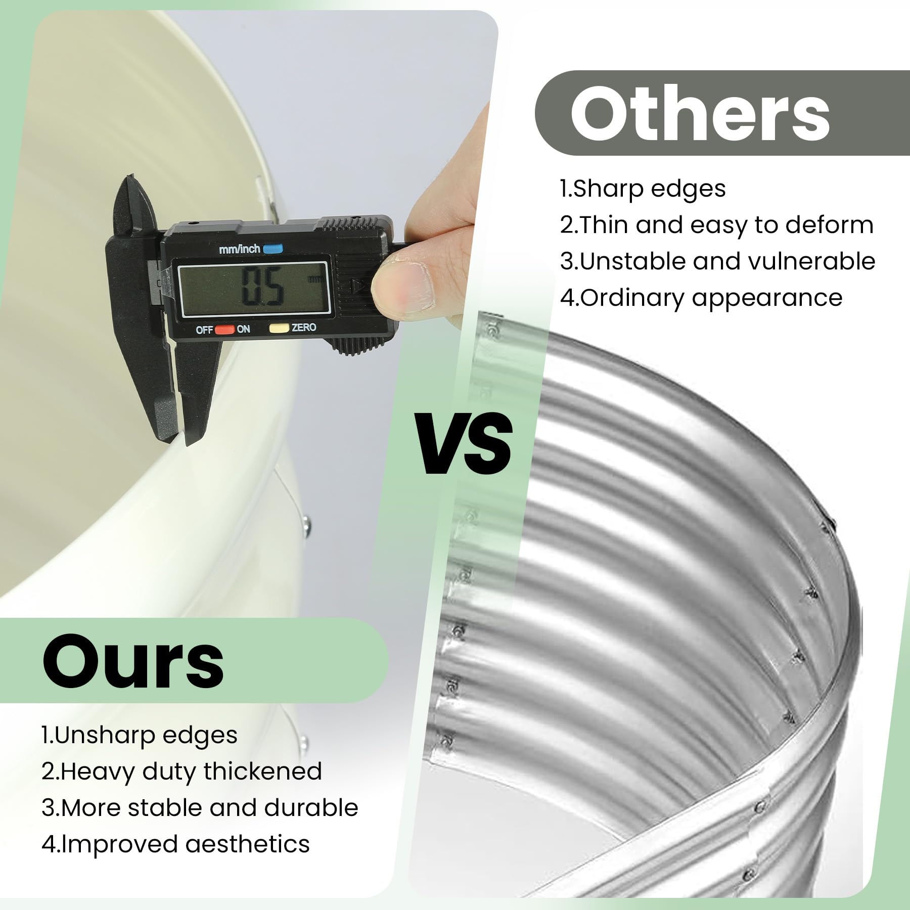 - Made from 0.5mm thick galvanized sheets, with seams overlapping up to 1.8mm for enhanced strength. Screw-fixed edges and an oval design provide extra sturdiness, ensuring the structure remains solid and stable even when filled with soil.