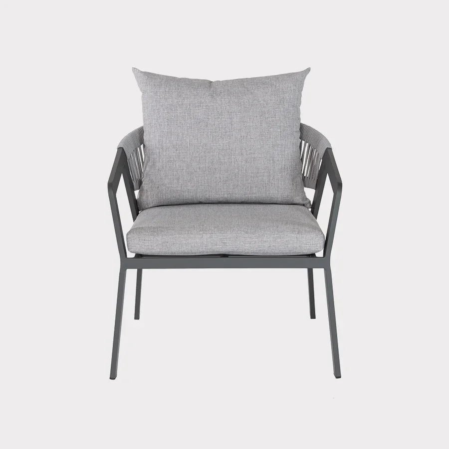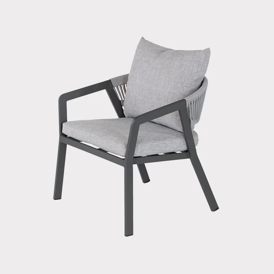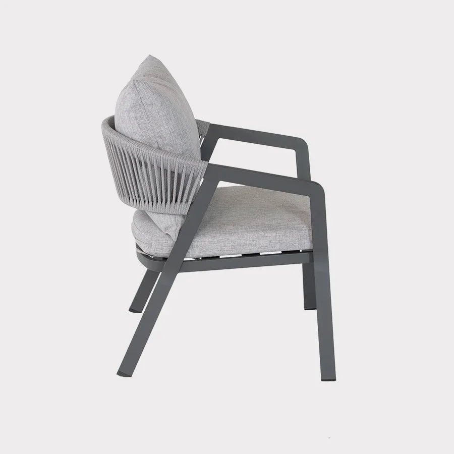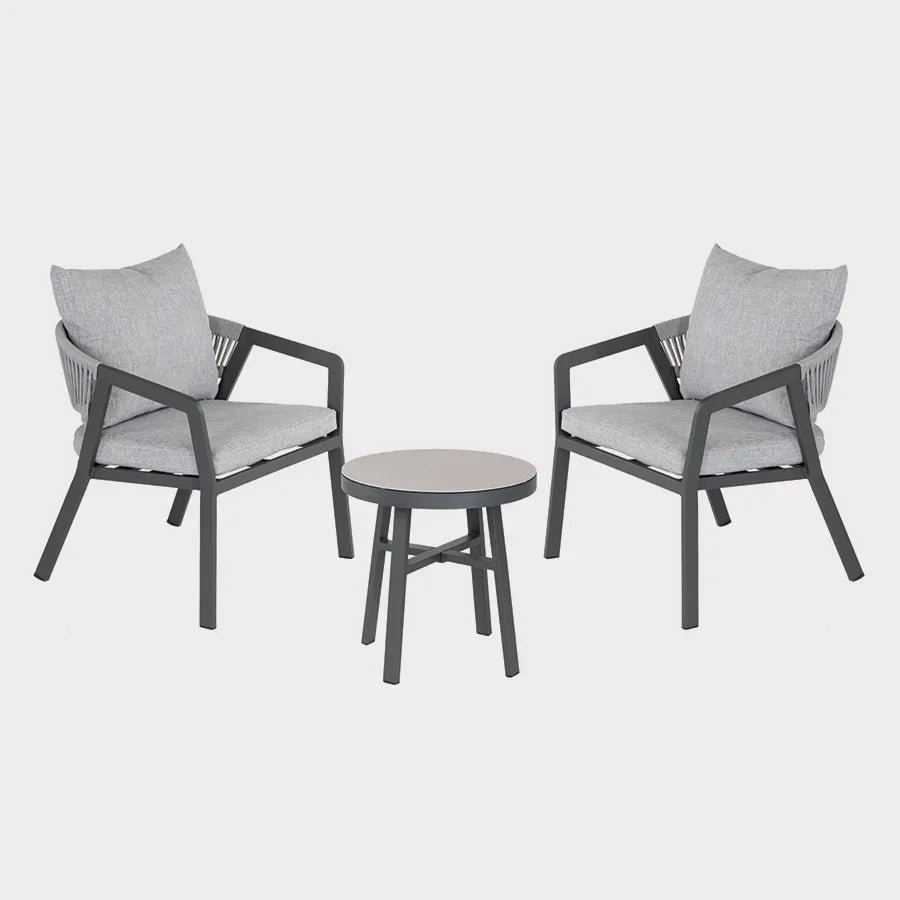 The Cassis Duo set is perfect for a balcony or small garden to relax in the sun or read a book. The set includes 2 x Cassis lounge chairs and side table. Made from an aluminium frame and the lounge chairs have a PVC rope weave and the side table has a grey finish glass top. Can be left outdoors all year round (excluding cushions). Other matching items in the range include a balcony set, 4 seat dining set and balcony parasol.