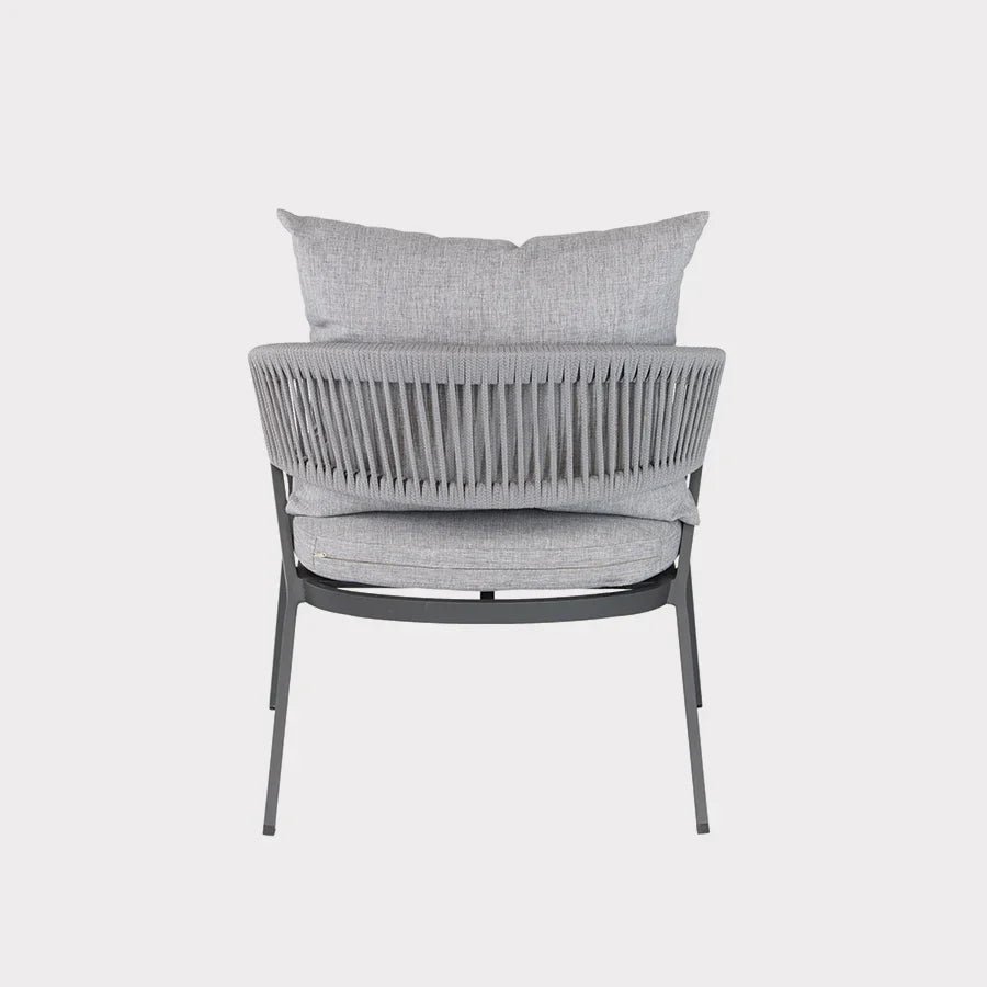 • Material: Lounge chairs are made with sturdy aluminium frame with PVC rope detailing. The side table has an aluminium frame with grey finish glass top