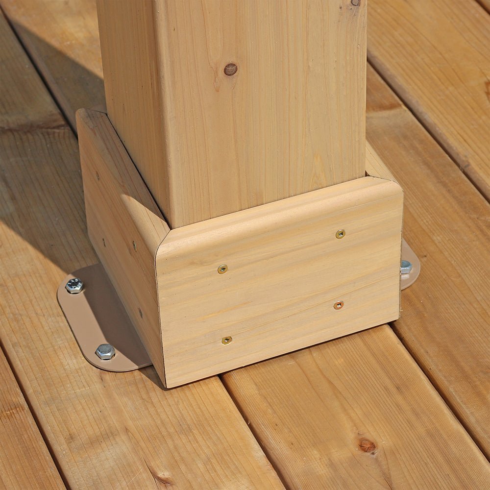 • Finished in a natural cedar stain and neutral coffee brown roof